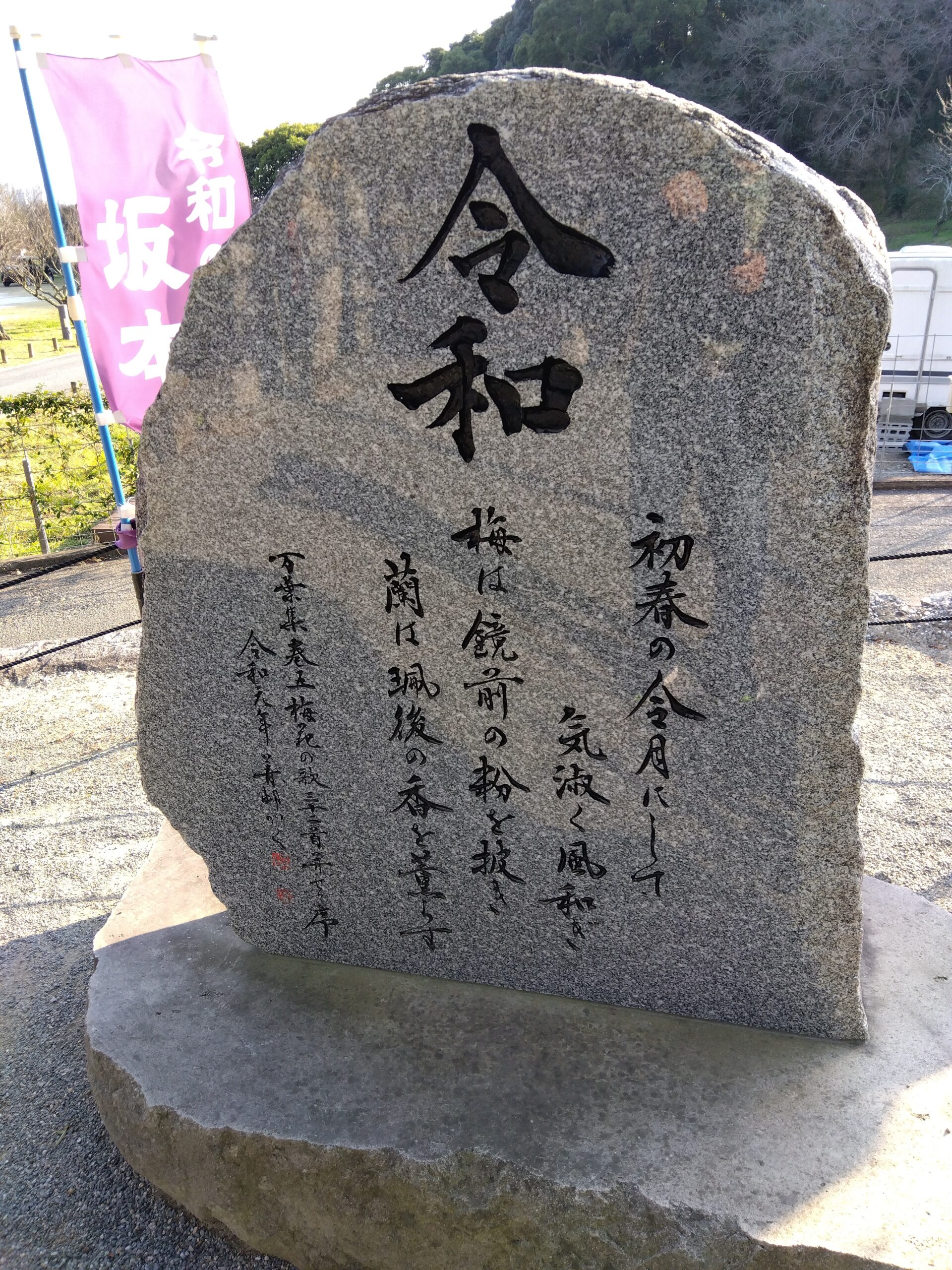 ・この梅花の宴を主催したのは、奈良時代の政治家で大納言も歴任した「大伴旅人」で、西暦730年に太宰府の長官(太宰師)として赴任しています。・「坂本八幡宮」は、之まで当地の守り神として応神天皇を祀っていますが、この一帯を大伴旅人の邸宅跡(推定3箇所の1候補地)とされ「令和」ゆかりの神社として親しまれています。