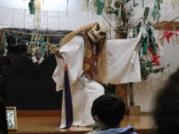 その後、天岩戸神社~天安河原~高千穂神社を参拝し、一旦宿で夕食を取り、初めての夜神楽を体験しました。夜8時から高千穂神社で4番の舞が行われ、天の岩戸にお隠れの天照大神を誘い出すストーリでした。